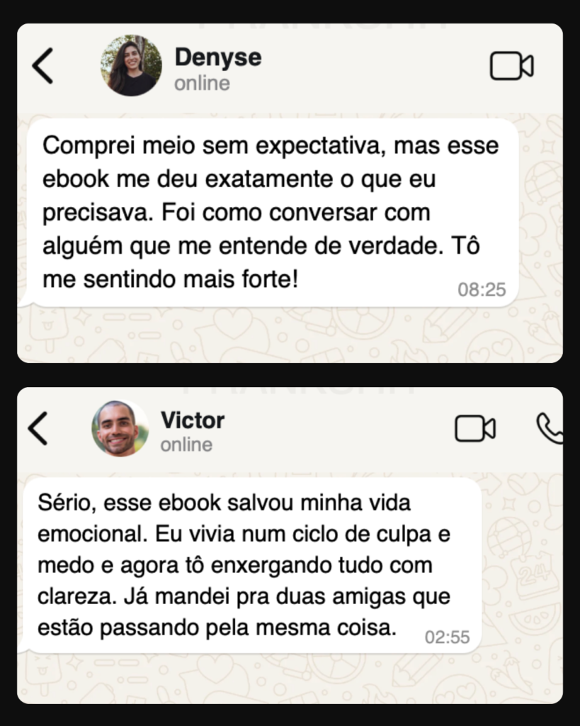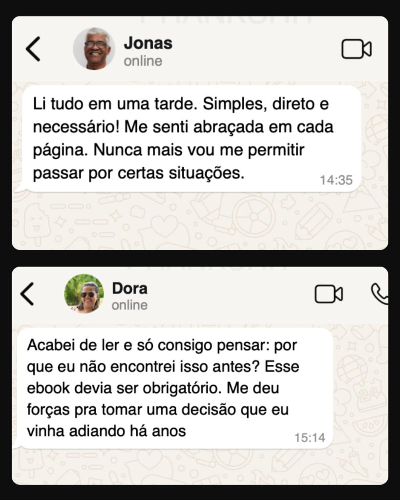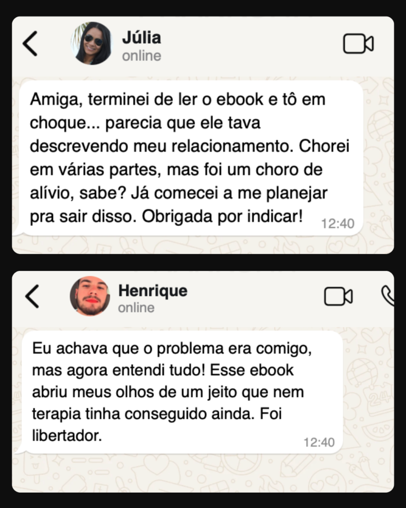 Com o ebook “Se Quem Te Ama Faz Isso, Mande Embora!”, você vai aprender como reconhecer os padrões de abuso emocional e sair dessa realidade com segurança, recuperando sua autoestima e sua liberdade emocional.